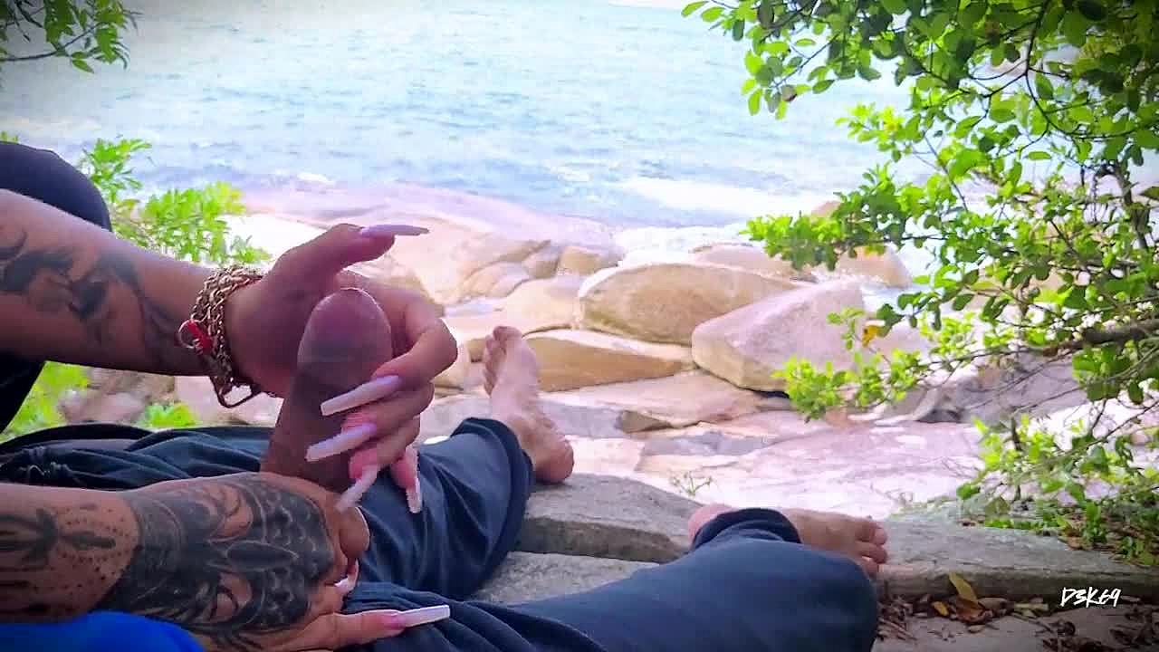 Horny african amateur masturbates with handjob to surprise cum orgasm outdoors on public beach