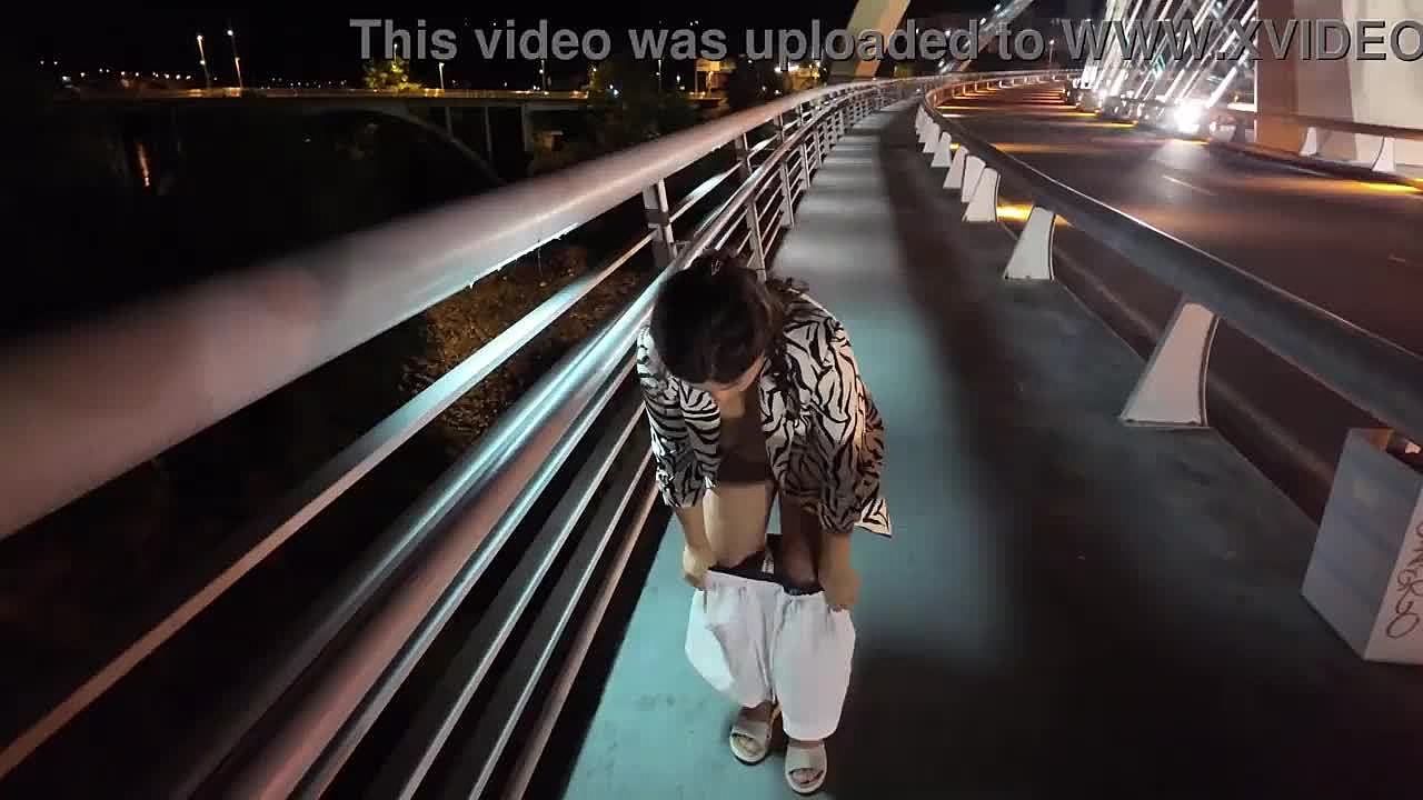 Luscious curvy milf struts braless pantyless on bridge flashing huge tits